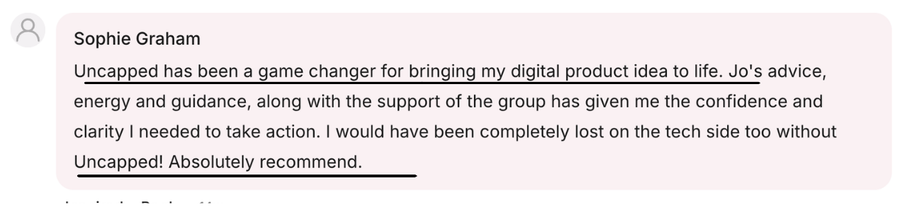 12 Months of Support & Coaching: Twice a month, you will meet with Jo and the other Uncapped members so you always know what you should (and shouldn’t) be working on to keep your online income growing. Worth $2499