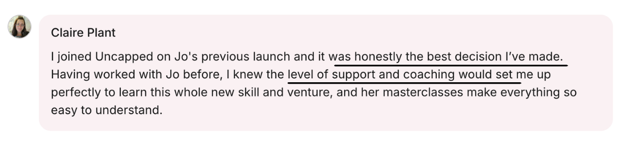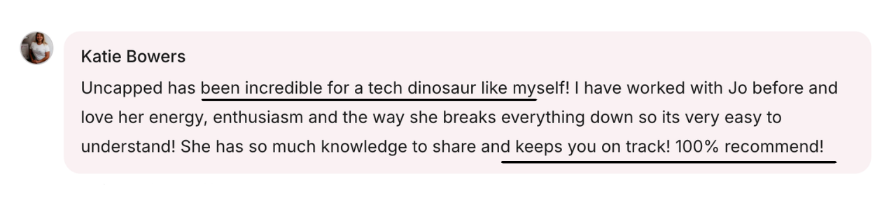 Twice a month, you will meet with Jo and the other Uncapped members to keep you accountable and focused. We review exactly what you’ve achieved, tackle your challenges, and set your goals so you always know what you should (and shouldn’t) be working on to keep your online income growing.